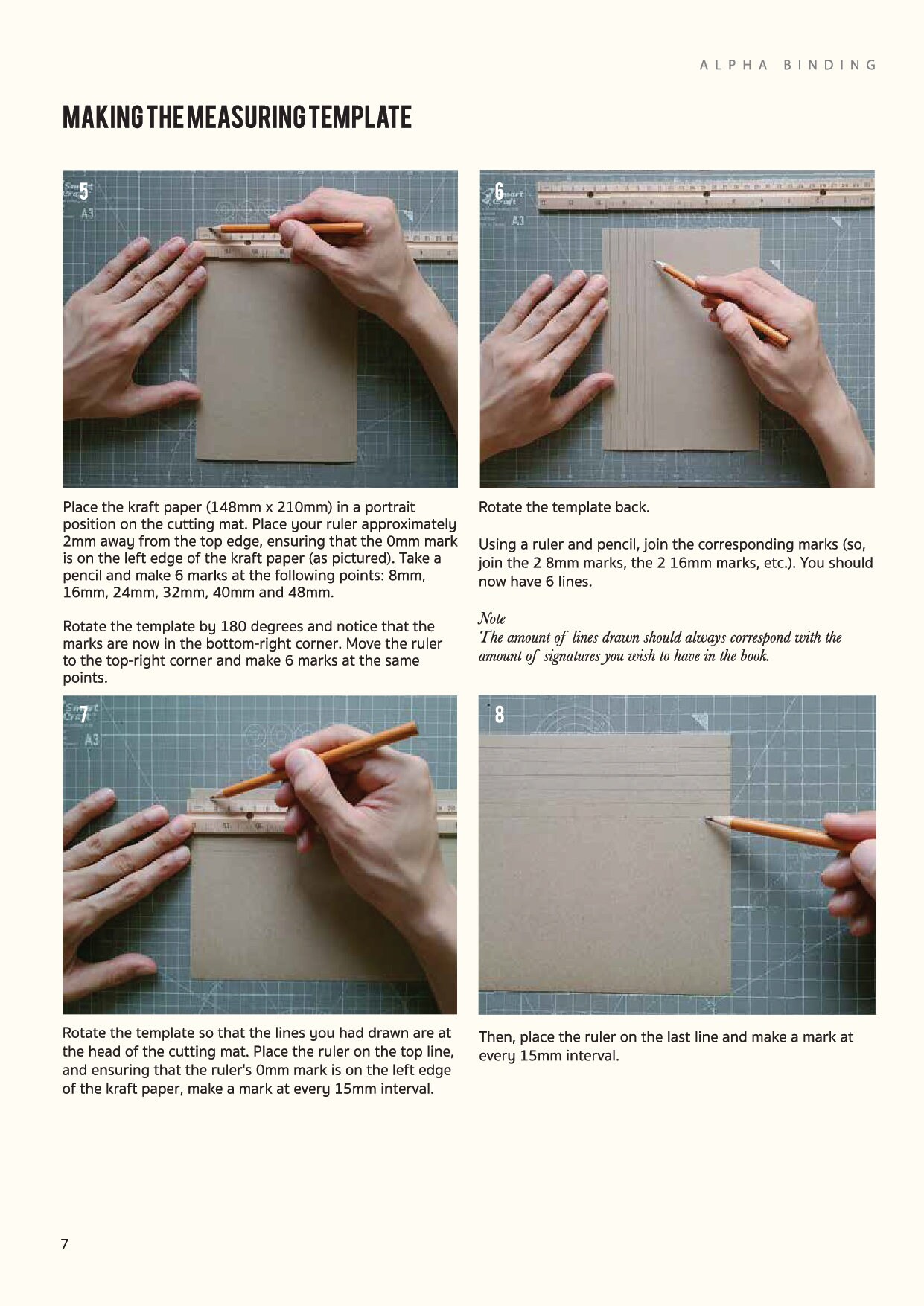 Alpha binding is a creative variation of the long-stitch method where the text block is hand-sewn to leather, leaving the spine beautifully exposed. This sewing style creates an elegant, continuing “α” pattern along the book’s spine. Its durability and aesthetic appeal make it perfect for crafting journals that are both functional and artistic.