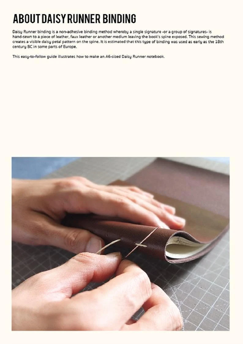 Learn the Daisy Runner Binding method to craft unique vegan leather notebooks! This beginner-friendly tutorial includes 25 pages and 70+ step-by-step photos.